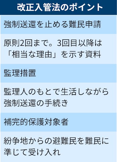 23年の通常国会で再び審議され、与党や日本維新の会、国民民主党などが賛成し成立した。衆参両院は難民申請の規定で施行後5年をめどに必要な改定を検討することを盛り込んだ付帯決議を採択した。